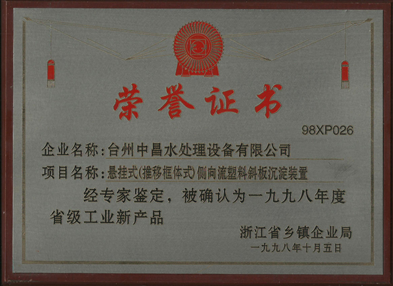 懸掛式側向流斜板榮譽(yù)證書(shū)