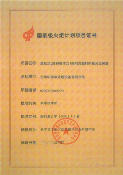 懸掛式側向流斜板--國家級火炬計劃項目證書(shū)