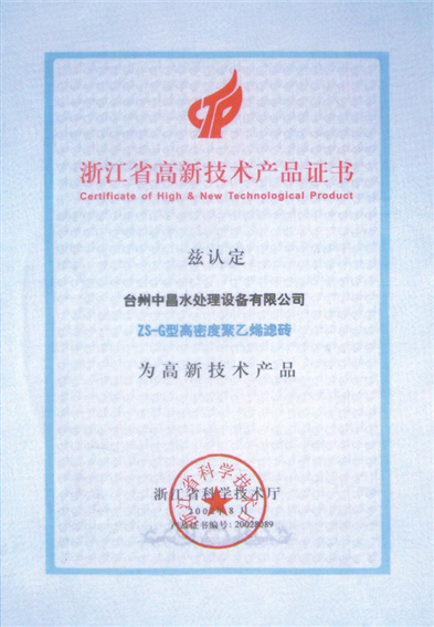 浙江省高新技術(shù)產(chǎn)品證書(shū)--濾磚