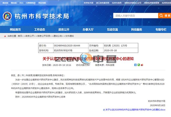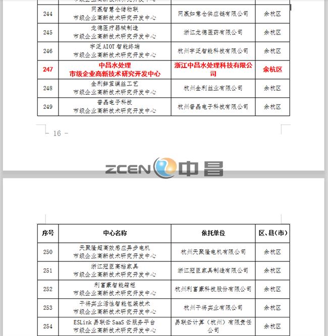 9月18日,杭州市科技局發(fā)布《關(guān)于認定2020年杭州市企業(yè)高新技術(shù)研究開(kāi)發(fā)中心的通知》文件,同意將依托于浙江中昌水處理科技有限公司的中昌水處理技術(shù)研發(fā)中心認定為杭州市企業(yè)高新技術(shù)研究開(kāi)發(fā)中心。